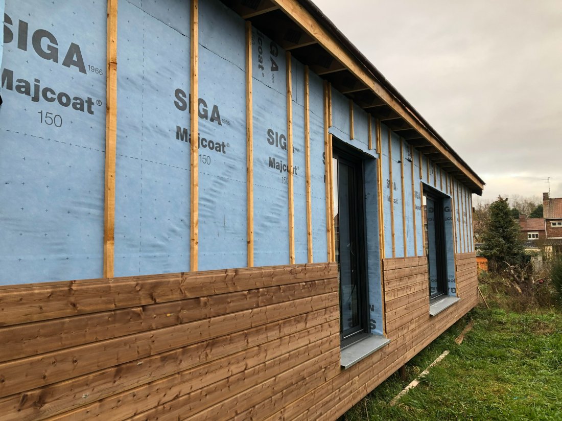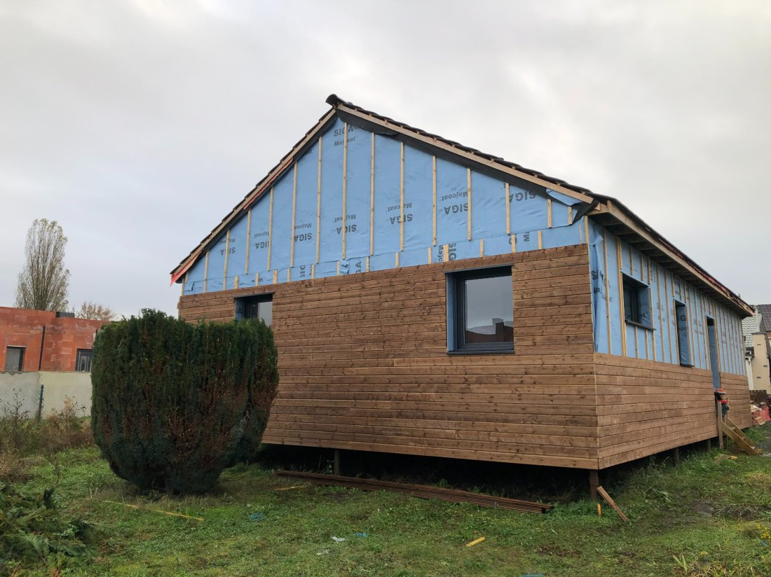 Pour ce projet situé à Courcelles Les Lens, notre objectif principal était de concevoir et réaliser une maison de plain-pied en bois, alliant performance énergétique, confort et esthétique. Cette maison de 97 m² habitables, comprenant trois chambres et une salle de bain, a été pensée pour offrir un cadre de vie sain, chaleureux et économe en énergie. Grâce à l’utilisation de matériaux de qualité – notamment un bardage en sapin autoclave marron posé horizontalement et des menuiseries aluminium noir RAL 9005 –, nous avons voulu garantir à la fois une excellente durabilité et une parfaite intégration dans l’environnement local.