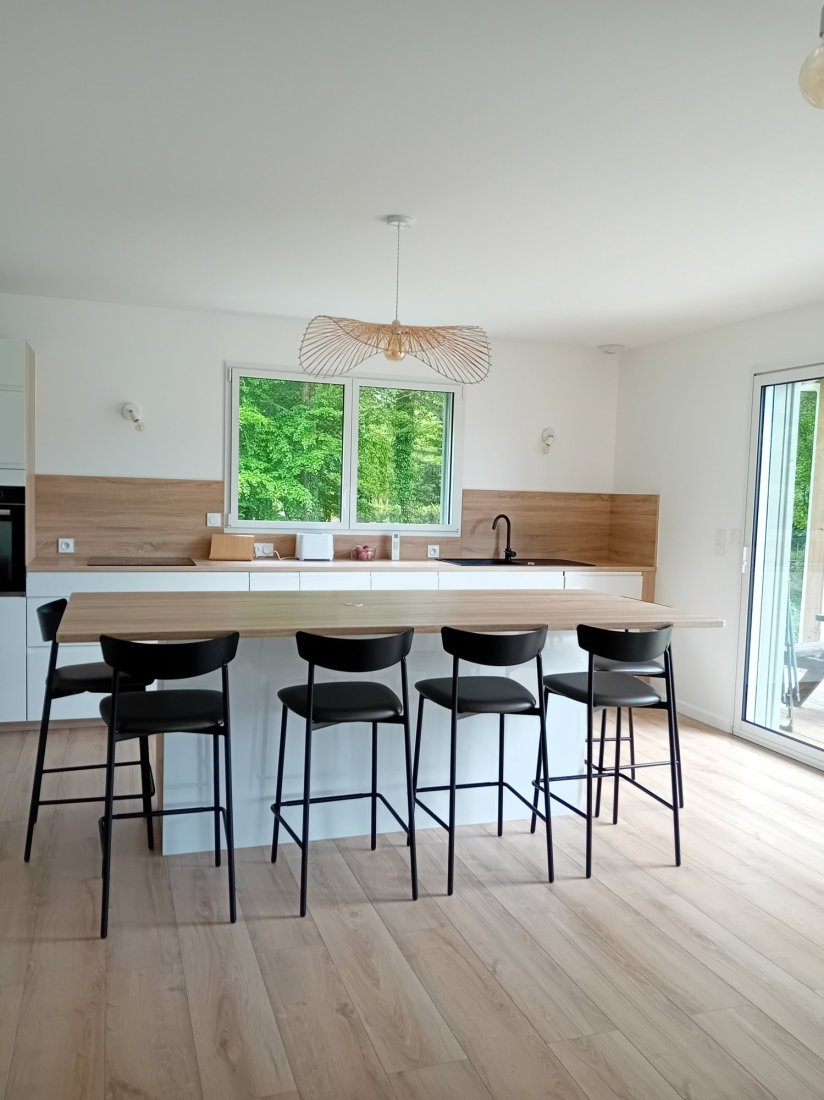 La maison construite respecte les standards les plus stricts en matière de construction bois. Le bardage sapin autoclave marron, posé horizontalement, offre un aspect chaleureux et naturel tout en protégeant la structure. L’isolation par laine soufflée dans le plancher bois permet de maintenir une température agréable été comme hiver, contribuant à obtenir la classe d’énergie A. Les menuiseries aluminium noir RAL 9005 assurent une grande luminosité intérieure tout en renforçant la sécurité et l’étanchéité du logement. Ce projet est ainsi un exemple concret d’habitat sain, durable et performant, parfaitement adapté aux besoins d’une famille moderne.
