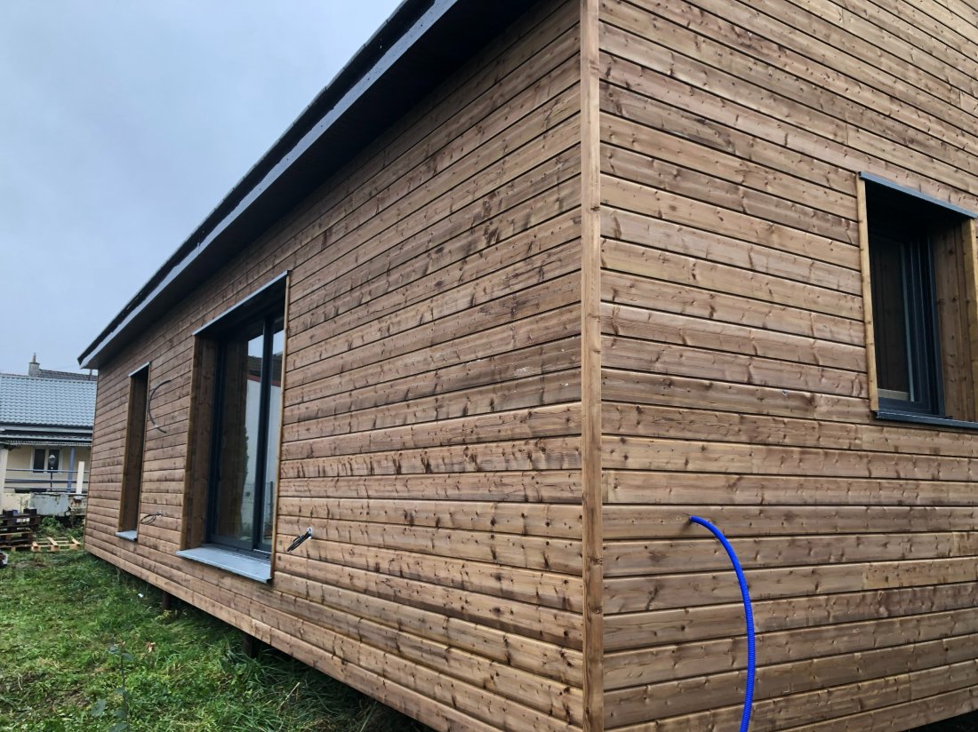 Maison de plain-pied contemporaine à Courcelles Les Lens (97 m²), bardée de sapin autoclave marron, dotée de menuiseries aluminium noires. Isolation performante, classe énergie A, 3 chambres, 1 salle de bain (2025).